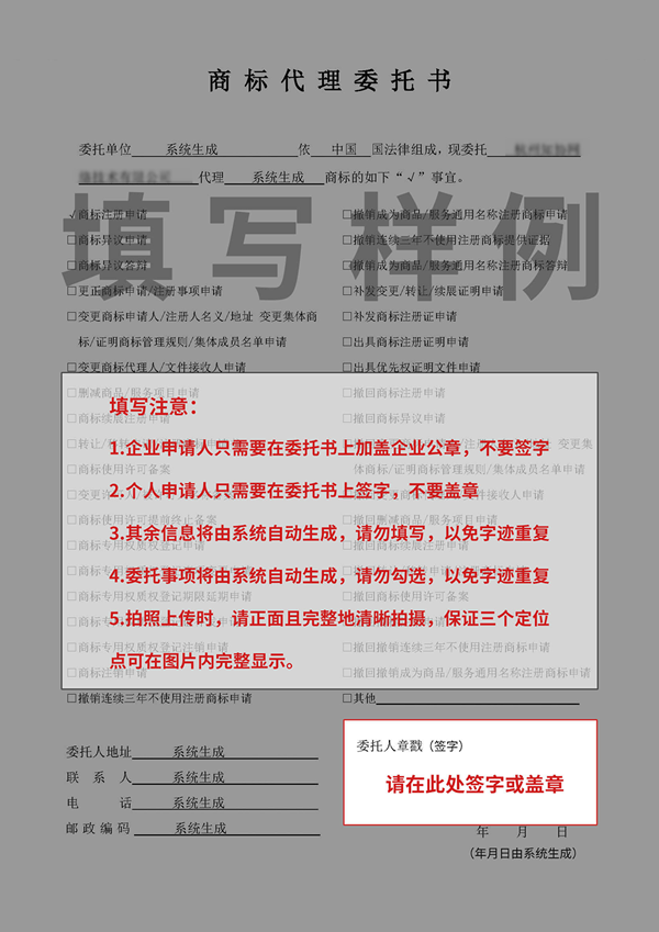 注:委托書已經(jīng)自動生成。請下載并打印,以自然人名義申請的需黑筆簽名,以企業(yè)名義申請的需蓋公章后,掃描彩色件并上傳;要求圖片為jpg格式。